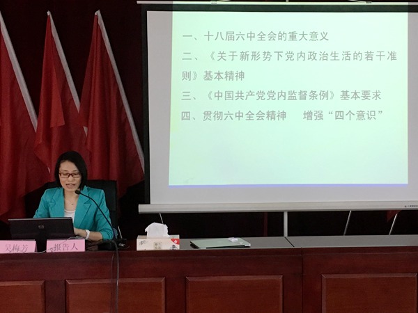 吴梅芳教授从全面从严治党的高度,深刻阐述了党的十八届六中全会的重大意义,紧紧围绕加强和规范党内政治生活的重要性等四个方面对《关于新形势下党内政治生活的若干准则》进行了重点解读,并就《中国共产党党内监督条例》修订的内容和特点等方面作了提炼分析,对学习贯彻党的十八届六中全会精神、不断强化“四个意识”提出了具体要求。她的报告系统全面,层次分明,站位高、解读准、接地气,既有理论深度,又有生动实例,对广大党员干部学习领会和掌握党的十八届六中全会精神,全面提升企业党建工作水平具有重要的指导意义和促进作用。