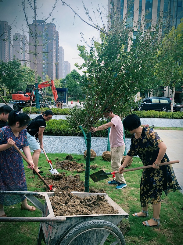 上午9时许,全体党员准时来到徽盐世纪广场商办楼前,开始植树活动。活动现场,党员们不顾天气炎热,相互协作,配合默契,展现出一片热火朝天的劳动场景。搬运树苗、挥锹挖坑、填土栽种……经过1个多小时的努力,六株葱郁的紫薇屹立于商办楼前,为徽盐世纪广场增添了一道亮丽的风景。随后,大家还小心翼翼地在树上系上“机关第一党支部种植”的铭牌,以此要求全体党员养护好这些树木,号召大家自觉养成植绿护绿的良好习惯。