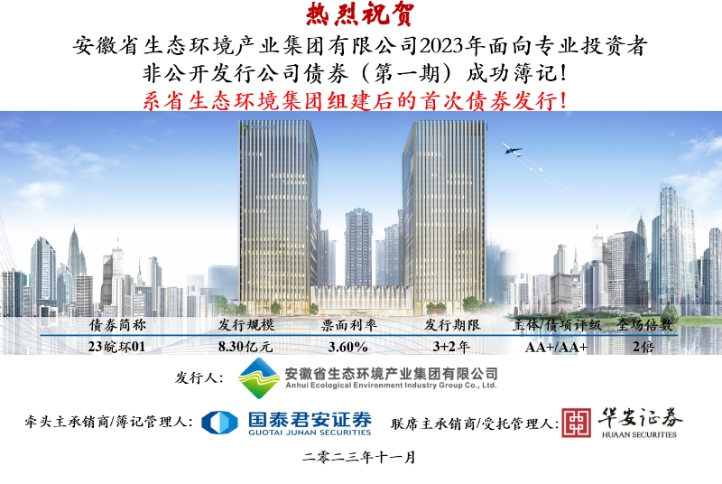 11月24日,省生态环境开云网页版·官方版在线首单非公开公司债券(债券简称:23皖环01,债券代码:253104.SH)在上海证券交易所成功簿记发行,本次债券由国泰君安、华安证券主承销,募集金额8.3亿元,期限3+2年,票面利率3.60%,圆满完成开云网页版·官方版在线挂牌以后在资本市场的首次亮相。