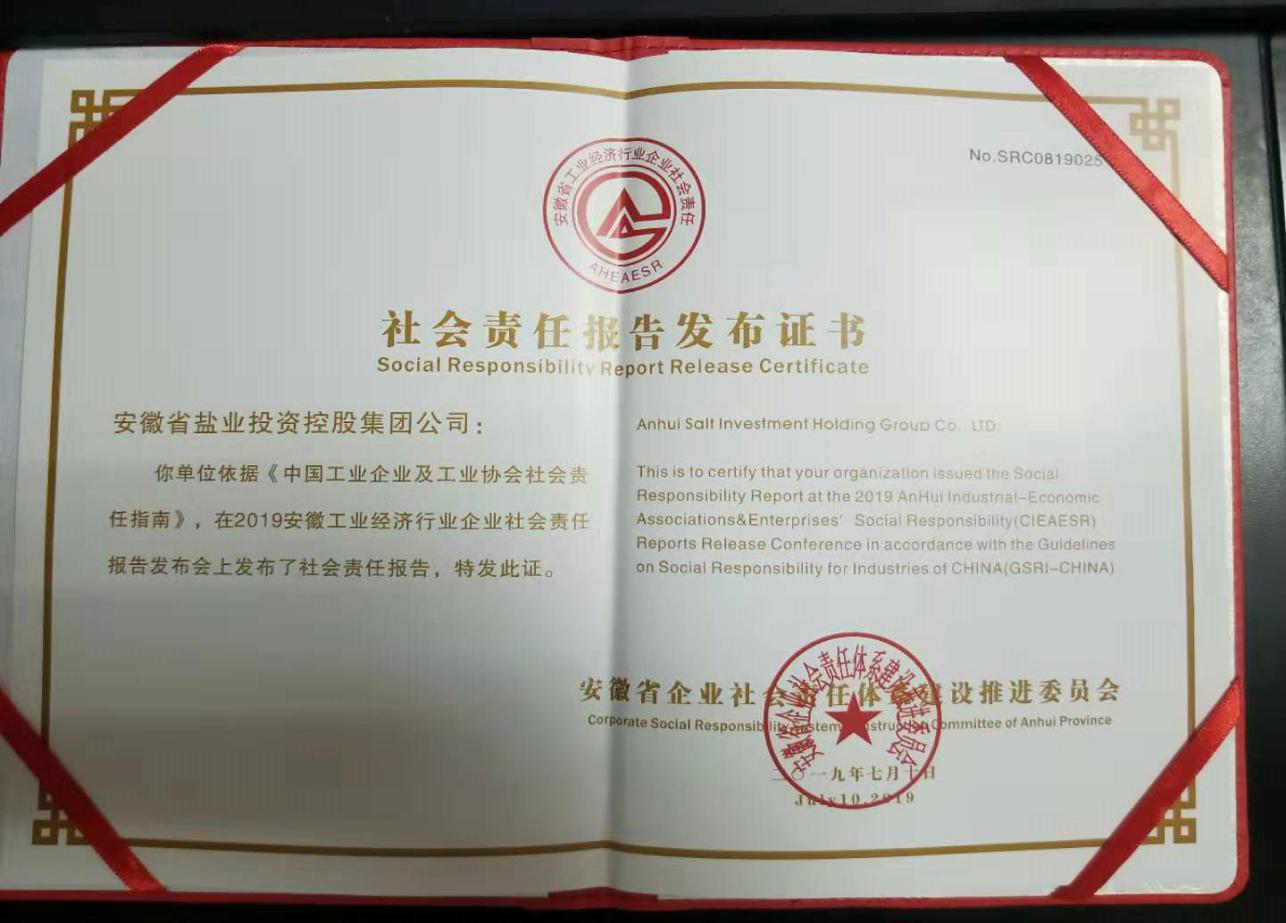 安徽盐业社会责任报告发布证书