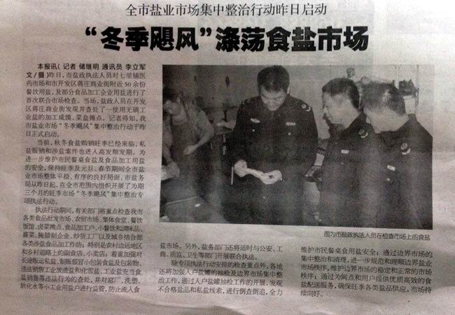 昨日,市盐政执法人员对七里铺医药市场和市开发区蒋庄商业街附近50余份餐饮用盐,及部分食品加工企业用盐进行了首次联合市场检查。当场,盐政人员在开发区蒋庄商业街发现并查处了一使用无碘工业盐的加工咸馍、菜盒摊点。记者得知,我市盐业市场“冬季飓风”集中整治行动于昨日正式启动。