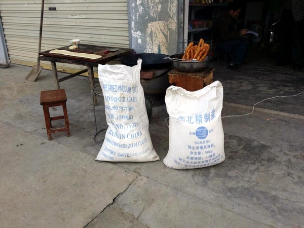 近日,市盐务局盐政执法人员对颍东区正午镇周边的食盐市场进行检查。在小李庄一家超市门前的一个油条摊点上,盐政执法人员发现一袋50公斤装的“三晶湖北精制盐”,执行标准为工业盐标准GB/T5462,同时发现一袋已经拆口使用、标注蓝色英文字母的散装盐品,该盐品无任何中文标识,无产地和执行标准。