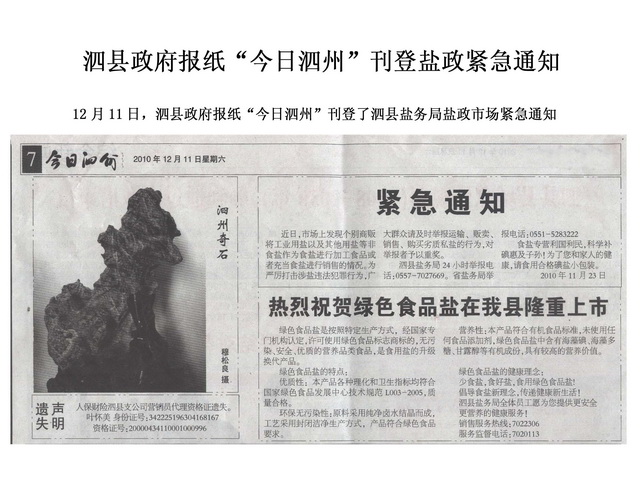 《今日泗州》刊登泗县盐务局盐政市场紧急通知