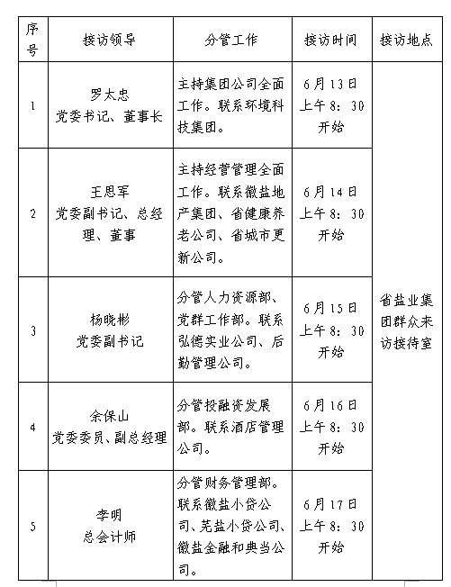 根据工作安排,现就省盐业开云网页版·官方版在线领导班子成员6月份接待省盐业系统职工群众来访安排公示如下: