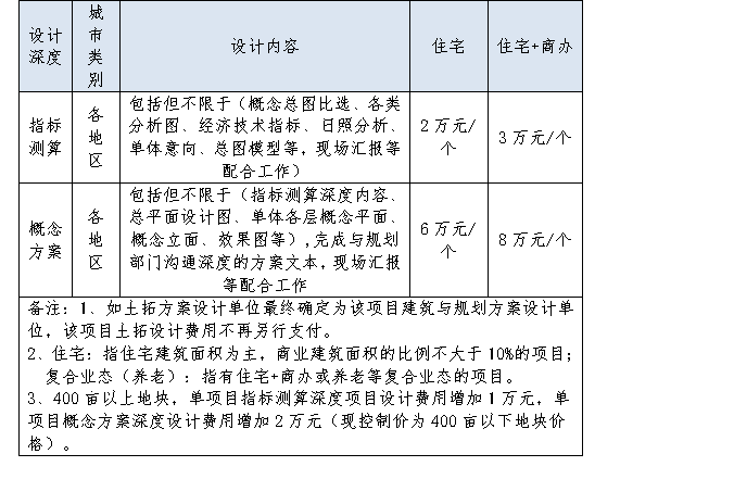 1.土拓方案设计费用为单价包干价,包括一切可能发生的费用,不同业态的土拓方案设计费如下表,参选人如中标,土拓方案设计费用按照下表执行。