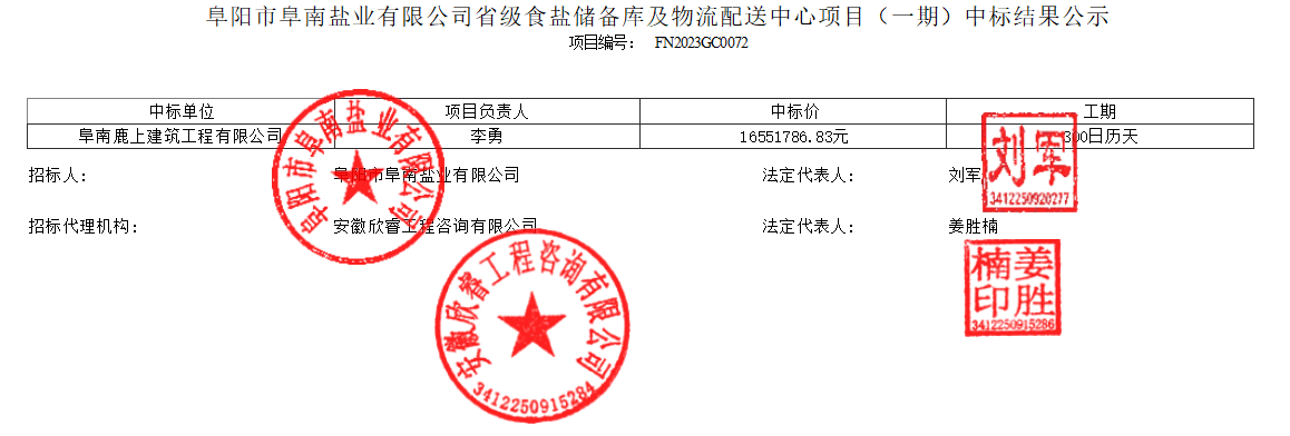 阜阳市阜南盐业有限公司省级食盐储备库及物流配送中心项目(一期)中标结果公示