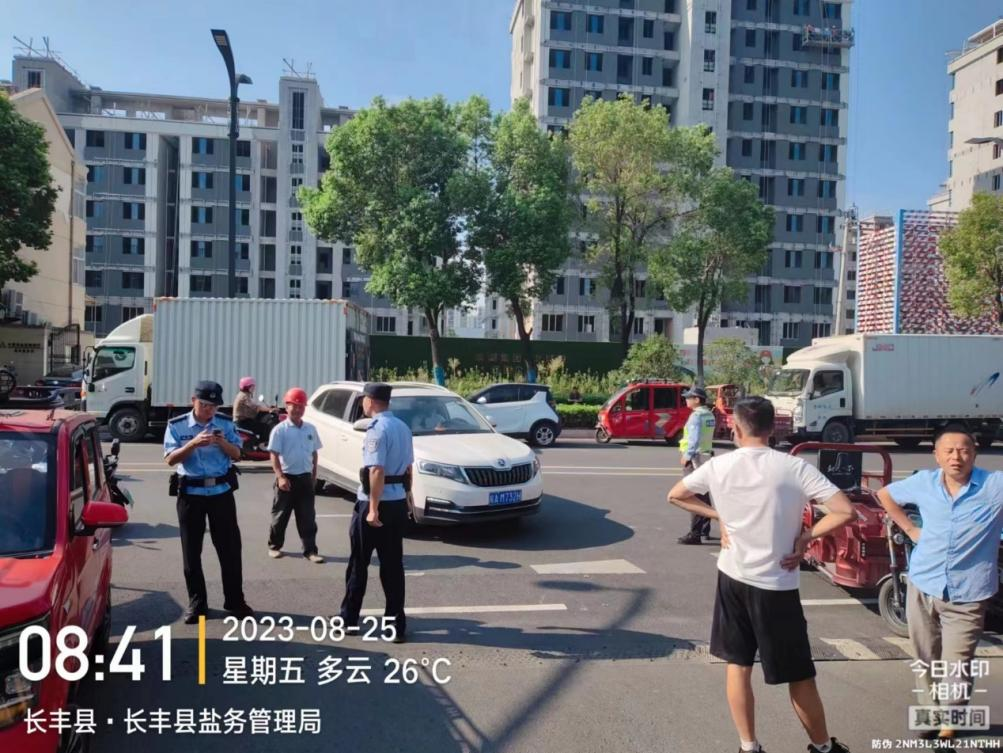 8月25日清晨,前来购买食盐的车辆排成了长龙,为了保障运盐车辆通行畅通,各县(市)盐业公司联系交警维持秩序。